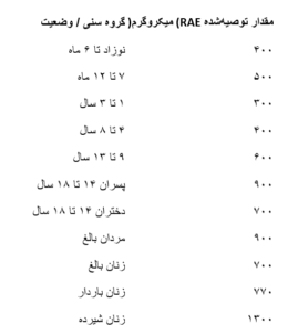 مقدار مورد نیاز روزانه ویتامین A بر حسب RAE (معادل فعالیت رتینول) و بهتناسب سن، جنس و شرایط فیزیولوژیک متغیر است. جدول زیر مقادیر توصیهشده را نشان میدهد: